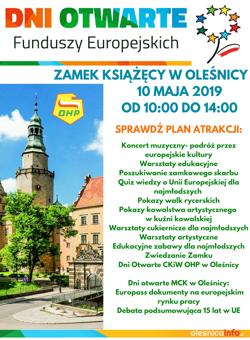 W programie m.in. koncert muzyczny – podróż przez europejskie kultury, warsztaty edukacyjne: rycerski turniej ortograficzny, chemiczne mikstury z alchemikiem Pepełką, z robotyką za pan brat, czy też poszukiwanie zamkowego skarbu. Zaplanowano quiz wiedzy o Unii Europejskiej dla najmłodszych. Dni Otwarte Centrum Kształcenia i Wychowania Ochotniczych Hufców Pracy w Oleśnicy, pokazy walk rycerskich, pokazy kowalstwa artystycznego w kuźni kowalskiej i warsztaty cukiernicze dla najmłodszych.