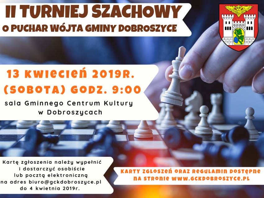 13 kwietnia od godziny 9 w sali Gminnego Centrum Kultury odbędzie II Turniej Szachowy o Puchar Wójta Gminy Dobroszyce.