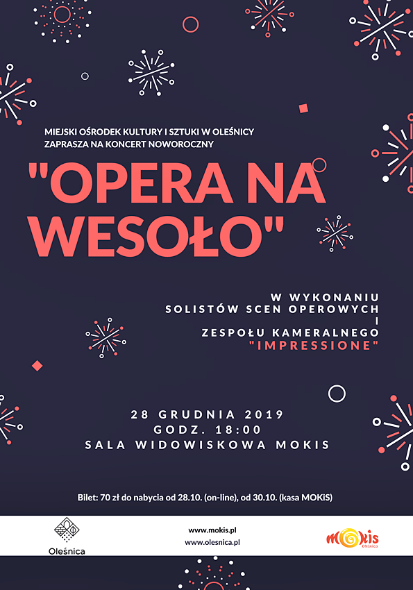 Miejski Ośrodek Kultury i Sztuki w Oleśnicy zaprasza 28 grudnia o godzinie 18 na koncert noworoczny „Opera na wesoło” w wykonaniu solistów scen operowych i zespołu kameralnego Impressione.