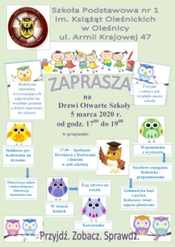 5 marca w Szkole Podstawowej nr 1 w Oleśnicy odbędzie się Dzień Otwarty. Początek spotkania z rodzicami i przyszłymi uczniami o godz. 17.