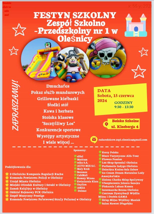 Już w najbliższą sobotę w godzinach od 9.30 do 13.30 w Zespole Szkolno-Przedszkolnym nr 1 w Oleśnicy odbędzie się festyn rodzinny. Festyn przygotowuje Rada Rodziców. – Proszę zabrać koce i dobry humor – zachęcają organizatorzy.