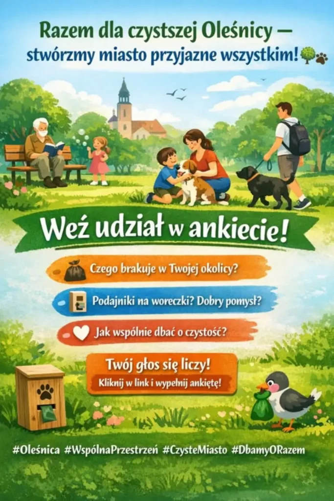 Fundacja Oleśnickie Bidy zaprasza mieszkańców do udziału w inicjatywie „Razem dla czystszej Oleśnicy – stwórzmy miasto przyjazne wszystkim!” To propozycja dla wszystkich, którym zależy na czystych parkach, skwerach i terenach spacerowych – miejscach bezpiecznych i komfortowych zarówno dla dzieci, seniorów, jak i opiekunów czworonogów.