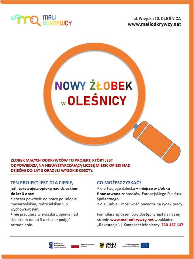 Mali odkrywcy zapraszają dzieci w wieku od 9 miesięcy do 3 lat. Dzięki uzyskaniu dofinansowania ze środków Europejskiego Funduszu Społecznego, pobyt w żłobku może być bezpłatny dla rodziców powracających na rynek pracy.