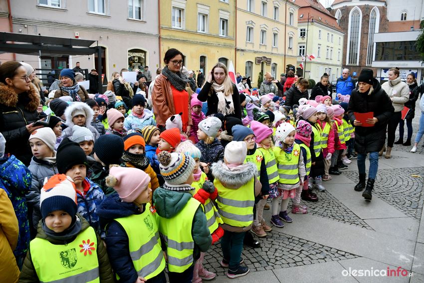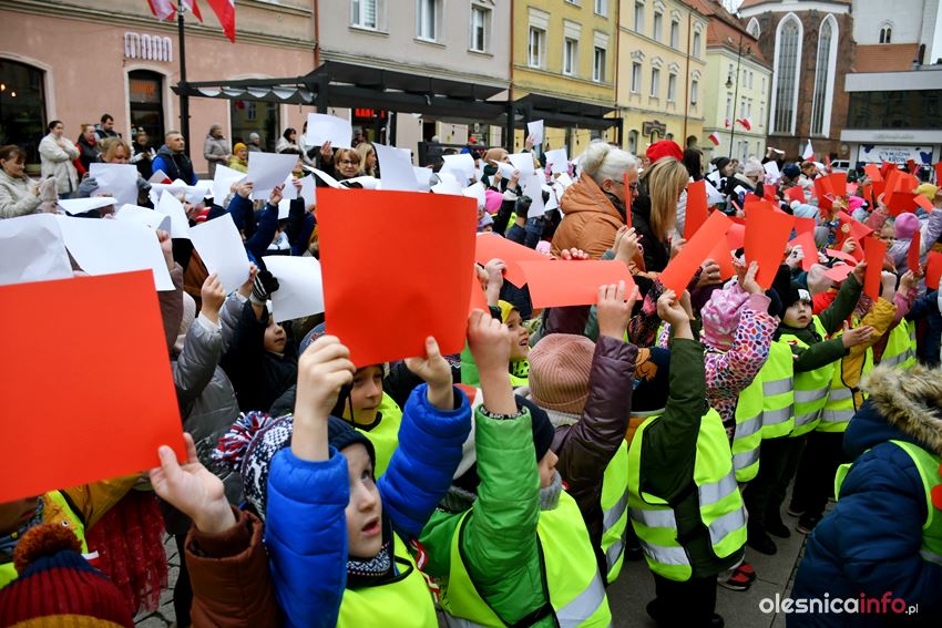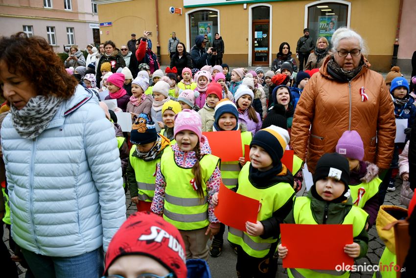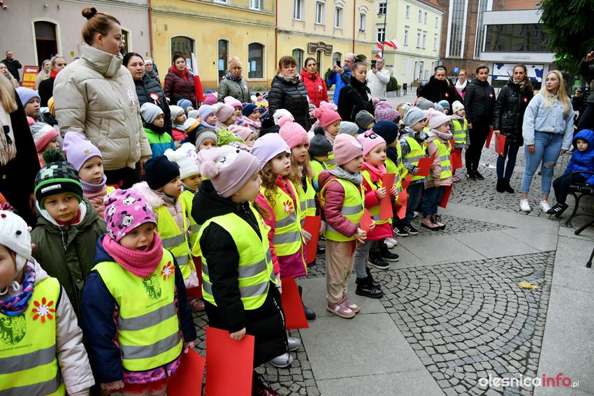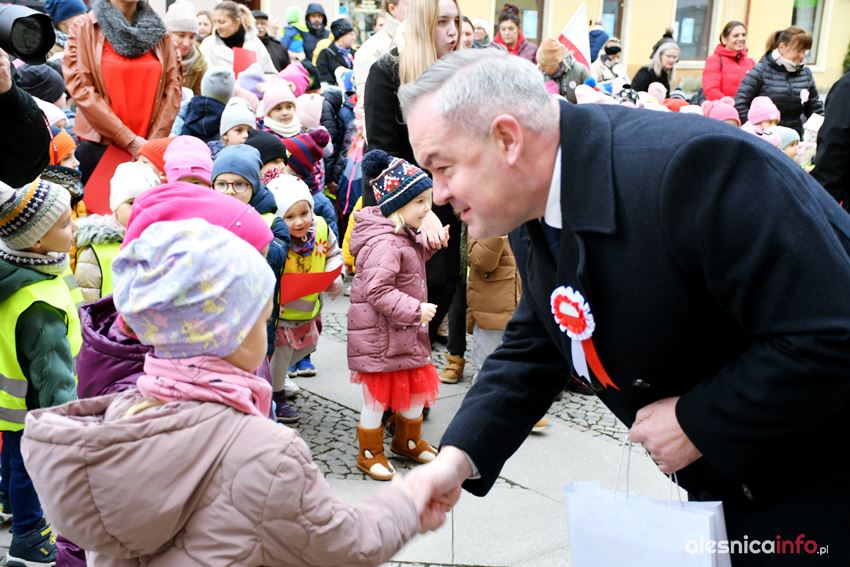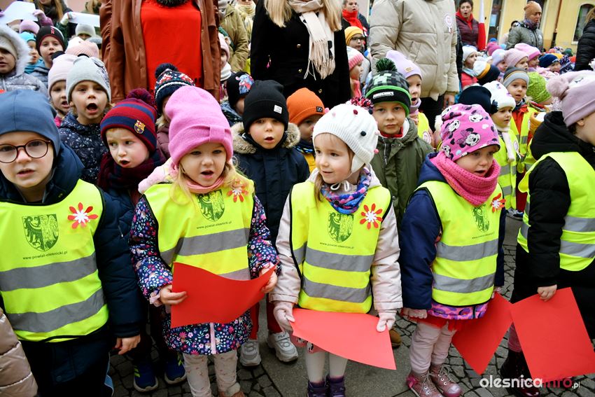 Dziś na oleśnickim rynku odbyła się uroczystość śpiewania hymnu przez oleśnickie przedszkolaki. Uroczystość, jak co roku, przygotowało Przedszkole n1, w imieniu których uczestników wydarzenia powitała Elżbieta Krowicka. Dzieci otrzymały upominki z rąk burmistrza Adama Horbacza.