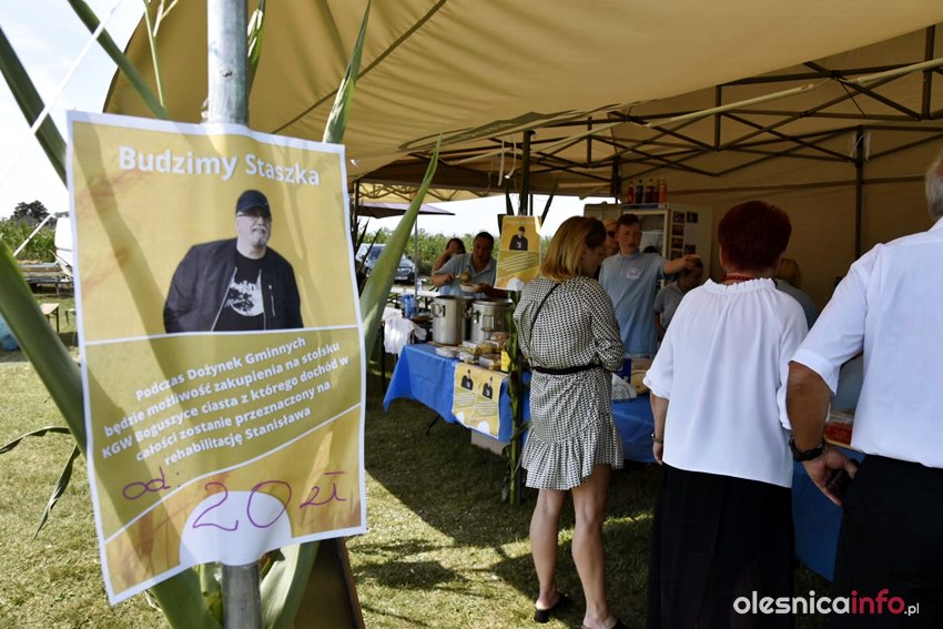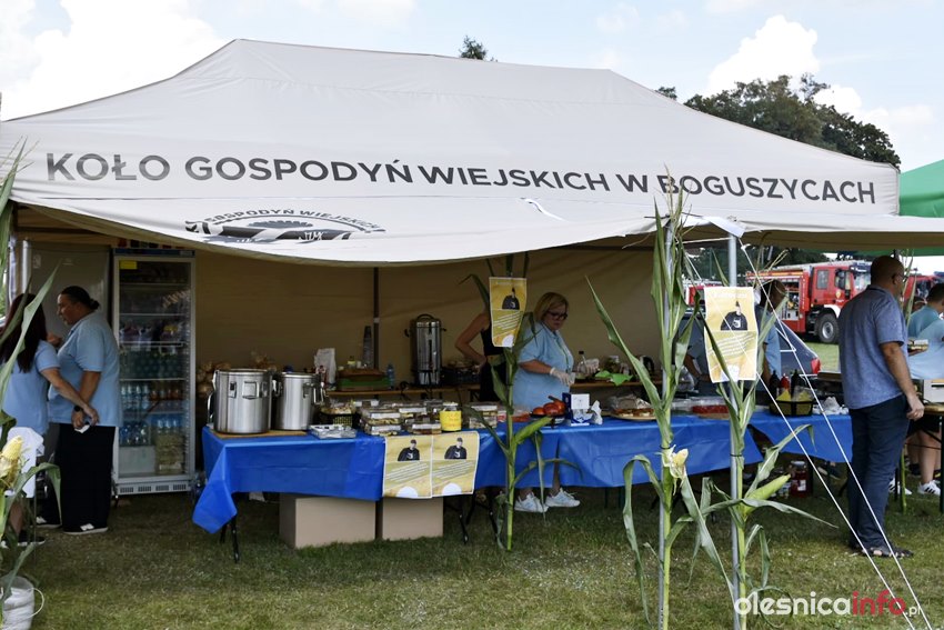 Po tej uroczystości odbyła się część obrzędowa przygotowana w tym roku przez zespół Jarzębina z Sokołowic. Później przedstawiciele sołectw przekazali dary wójtowi Marcinowi Kasinie, któremu na scenie towarzyszyła żona Agnieszka. Symboliczny bochen chleba trafił do starostów dożynek. Przez cały dzień w Boguszycach prezentują się gminne zespoły ludowe oraz Koła Gospodyń Wiejskich. Gwiazdą wieczoru będzie zespół Tulia.