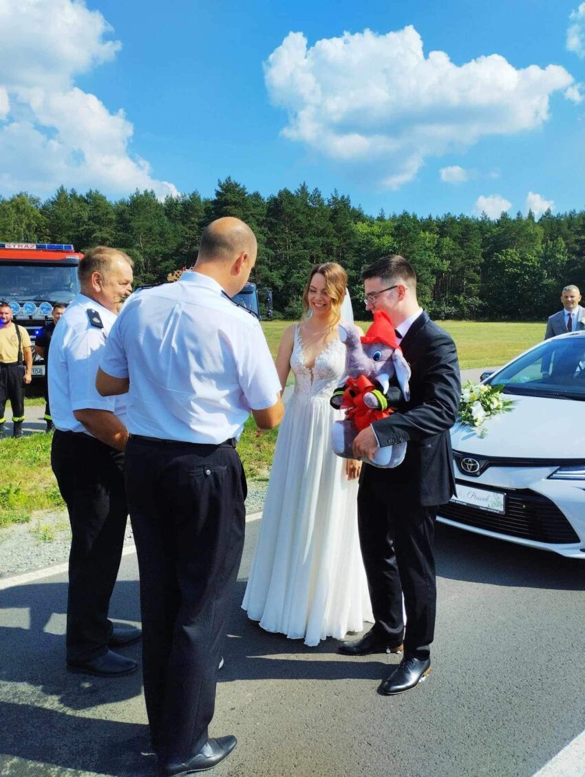– W dniu dzisiejszym mieliśmy okazję być częścią przepięknej ceremonii ślubnej, w której w rolę Pana Młodego wcielił się Burmistrz M. i G. Twardogóra Pan Paweł Czuliński oraz świeżo upieczona Małżonka – napisali w mediach społecznościowych strażacy z Twardogóry. – Wspólnie ze wszystkimi jednostkami OSP z terenu Miasta i Gminy Twardogóra spotkaliśmy się przy boisku sportowym w Goszczu, gdzie utworzyliśmy dla Nowożeńców tradycyjną „Bramę Strażacką” wraz z szpalerem wodnym. W imieniu wszystkich jednostek życzenia oraz drobny upominek Nowożeńcom wręczył Prezes oraz Komendant Gminnego Oddziału ZOSP RP.