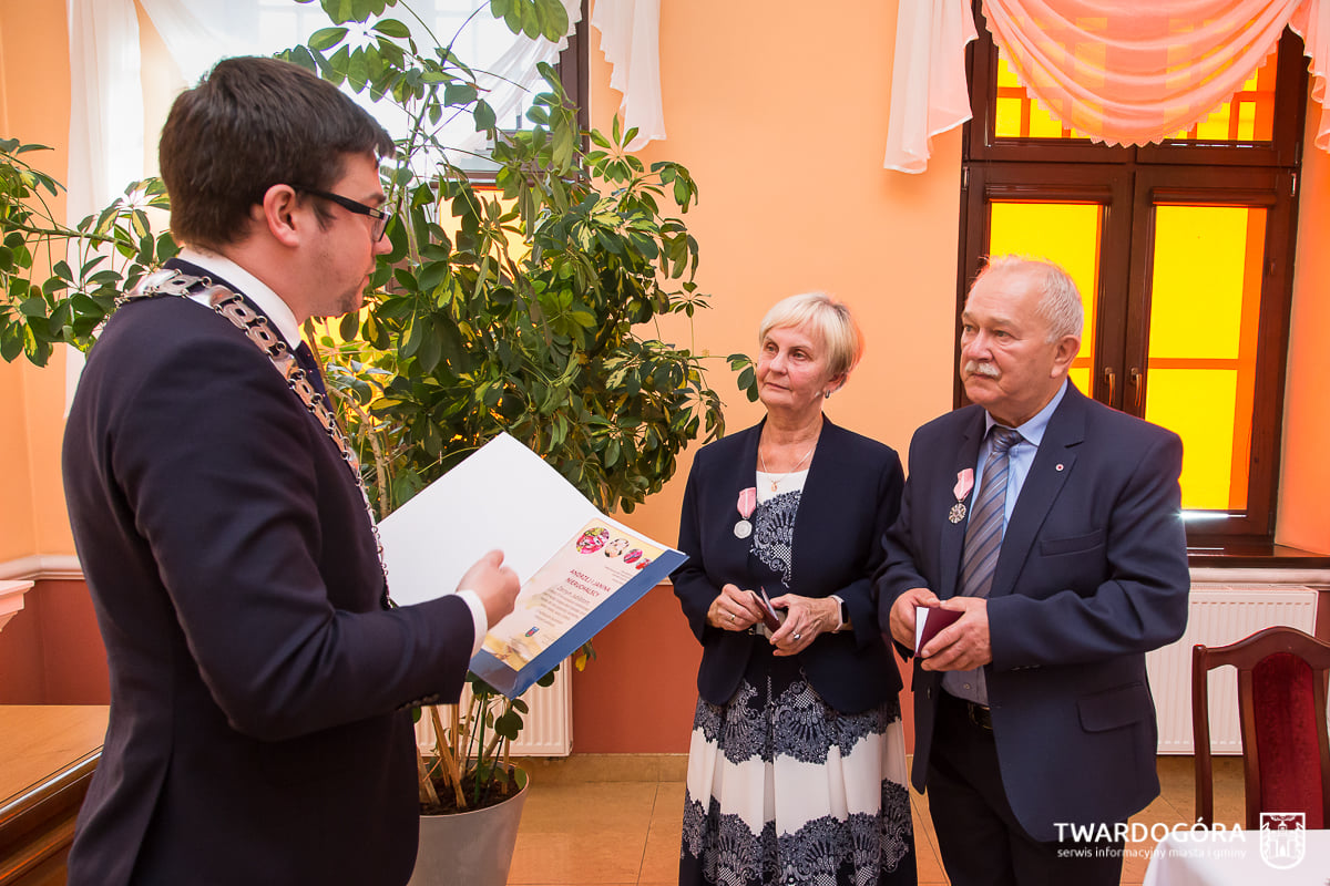 Janina i Andrzej Nieruchalscy oraz Monika i Kazimierz Zima odebrali dziś z rąk burmistrza Paweł Czuliński medale, kwiaty i listy gratulacyjne z okazji 50-lecia pożycia małżeńskiego