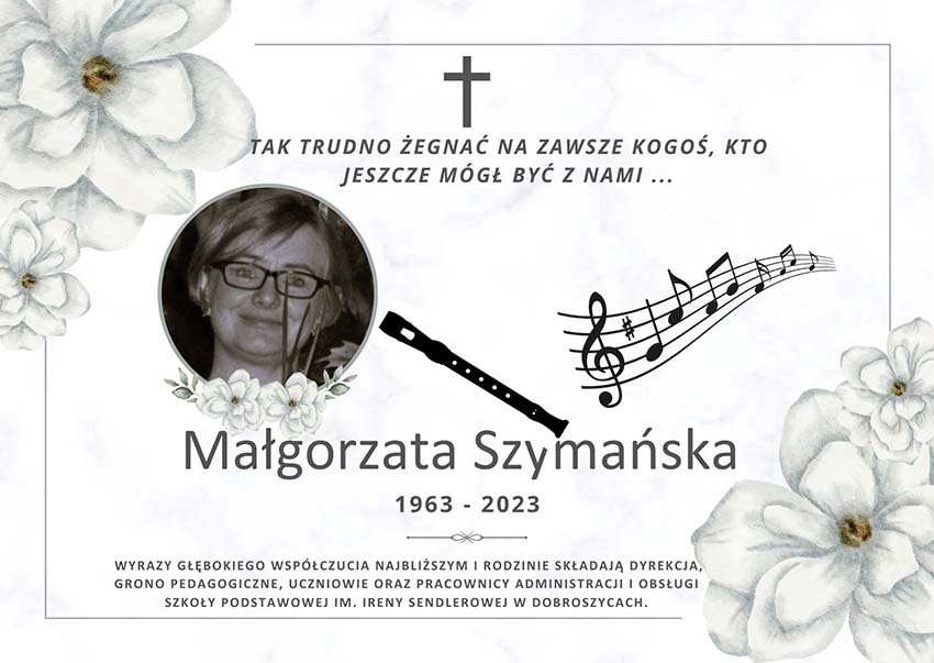 Szkoła Podstawowa im. Ireny Sendlerowej w Dobroszycach składa kondolencje bliskim i żegna Małgorzatę Szymańską.