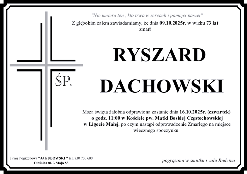 Msza św. żałobna zostanie odprawiona 16 października o godzinie 11 w kościele w Ligocie Małej, po czym nastąpi odprowadzenie zmarłego na miejsce wiecznego spoczynku.