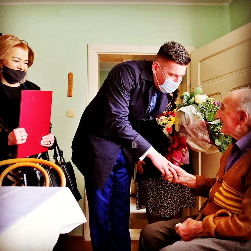 Czesław Adamski ze Ślizowa obchodzi dzisiaj swoje urodziny. – Wiele wzruszeń, sporo emocji towarzyszyło dzisiejszemu spotkaniu – informuje Dariusz Maniak, burmistrz Sycowa. – Wszyscy zgodnie życzyliśmy Panu Czesławowi dużo, dużo zdrowia na kolejne lata. Jubilat czuje się dobrze, ma świetną pamięć i bardzo chętnie podzielił się historią życia.