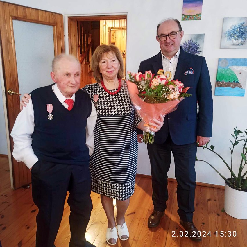 Jubilaci zostali odznaczeni Medalami za Długoletnie Pożycie Małżeńskie przyznanymi przez Prezydenta RP Andrzeja Dudę! Odebrali je w ratuszu i w domu z rąk burmistrza Jana Bronsia.