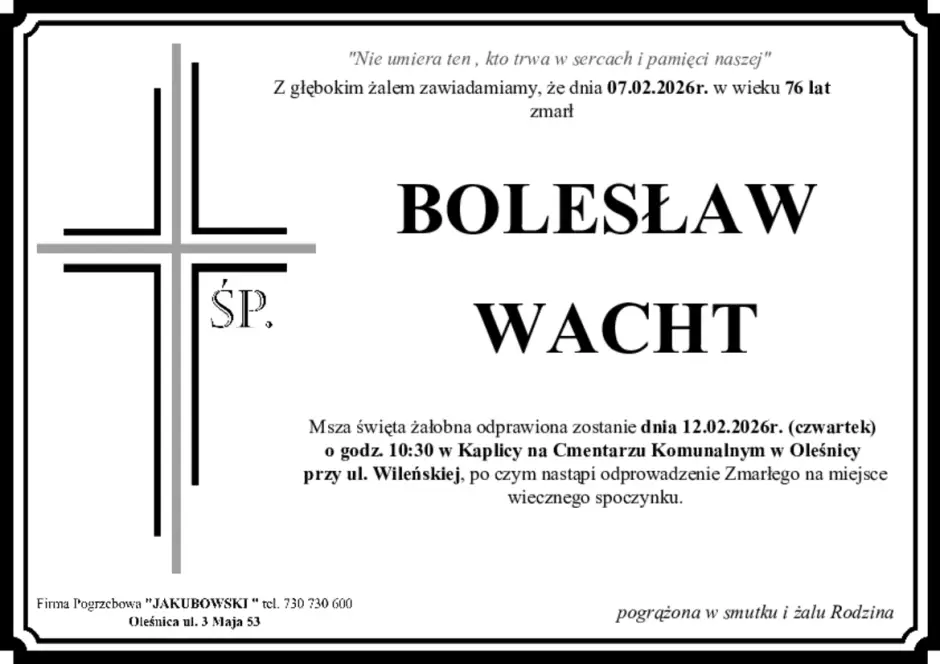7 lutego w wieku 76 lat zmarł Bolesław Wacht.