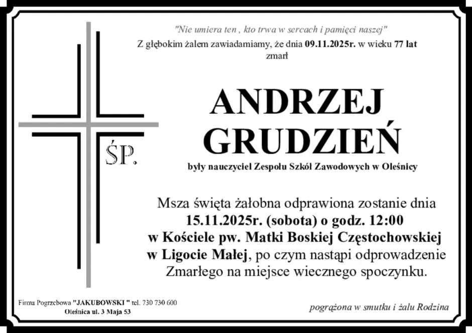 Msza św. pogrzebowa zostanie odprawiona 15 listopada o godz. 12 w kościele w Ligocie Małej, po czym nastąpi odprowadzenie zmarłego na miejsce wiecznego spoczynku.