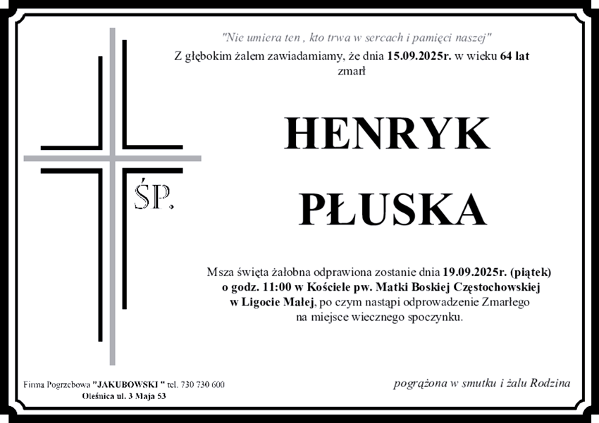 15 września w wieku 64 lat zmarł Henryk Płuska.