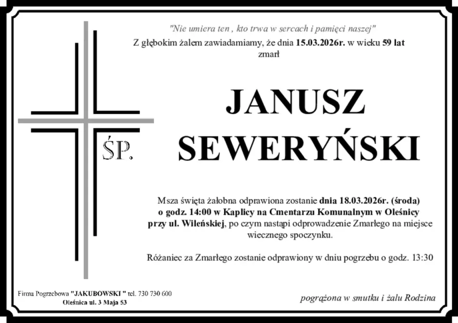 Msza św. żałobna zostanie odprawiona 18 marca o godz. 14 w kaplicy na cmentarzu przy ul. Wileńskiej w Oleśnicy, po czym nastąpi odprowadzenie zmarłego na miejsce wiecznego spoczynku.