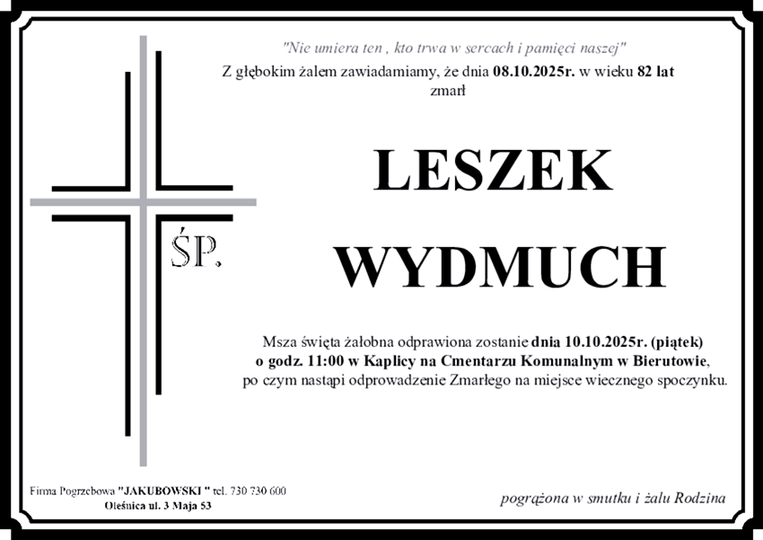 8 października w wieku 82 lat zmarł Leszek Wydmuch. Pogrzeb odbędzie się 10 października o godzinie 11 w kaplicy na cmentarzu w Bierutowie, po czym nastąpi odprowadzenie zmarłego na miejsce wiecznego spoczynku.