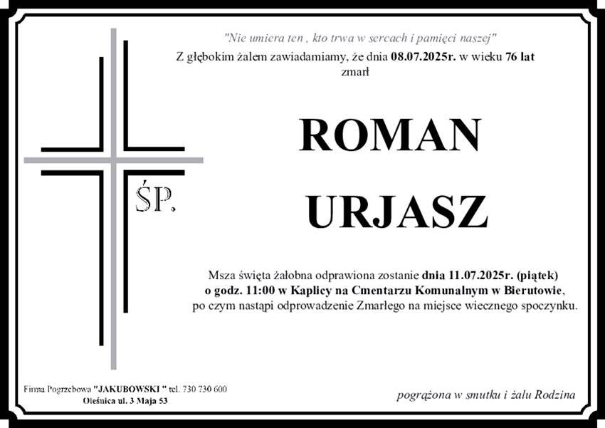 8 lipca w wieku 76 lat zmarł Roman Urjasz.