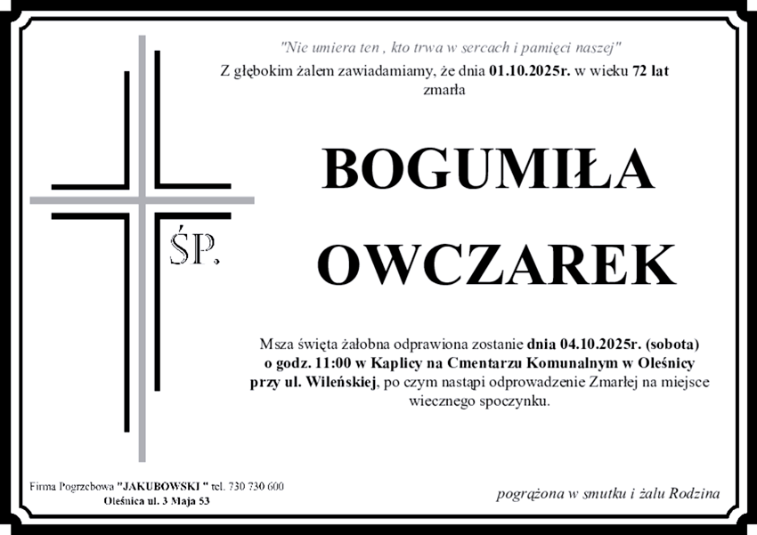 Msza św. żałobna zostanie odprawiona 4 października o godz. 11 w kaplicy na cmentarzu przy ul. Wileńskiej, po czym nastąpi odprowadzenie zmarłej na miejsce wiecznego spoczynku.
