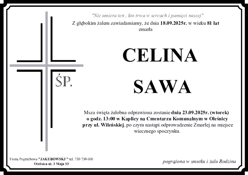 18 września w wieku 81 lat zmarła Celina Sawa.
