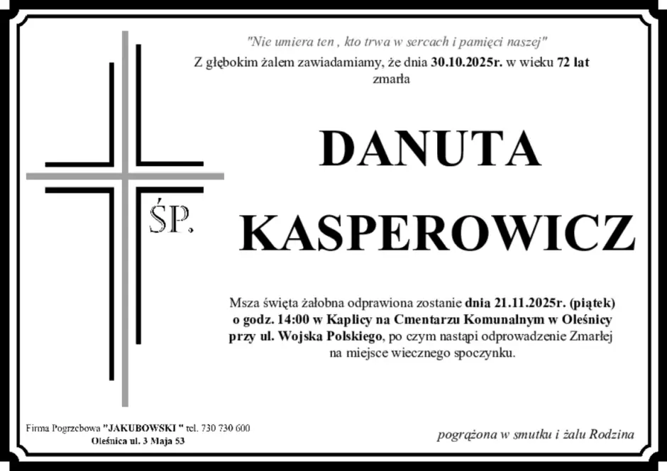Msza św. żałobna zostanie odprawiona 21 listopada o godz. 14 w kaplicy na cmentarzu przy ul. Wojska Polskiego w Oleśnicy, po czym nastąpi odprowadzenie zmarłej na miejsce wiecznego spoczynku.