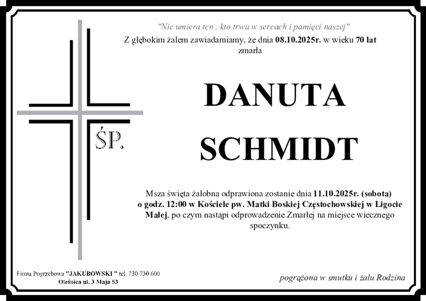 Msza św. żałobna odbędzie się 11 października o godz. 12 w kościele w Ligocie Małej, po czym nastąpi odprowadzenie zmarłej na miejsce wiecznego spoczynku.