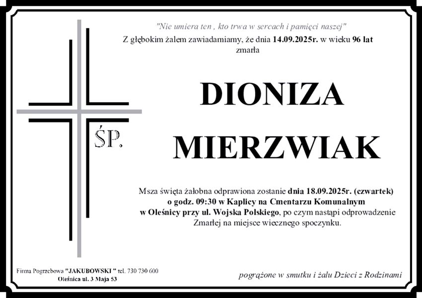 14 września w wieku 96 lat zmarła Dioniza Mierzwiak.