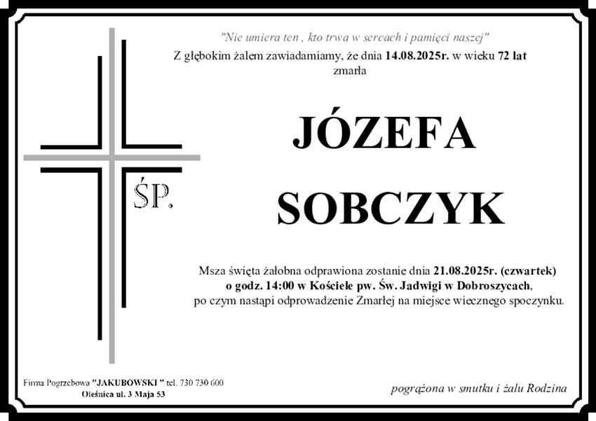 14 sierpnia w wieku 72 lat zmarła Józefa Sobczyk.