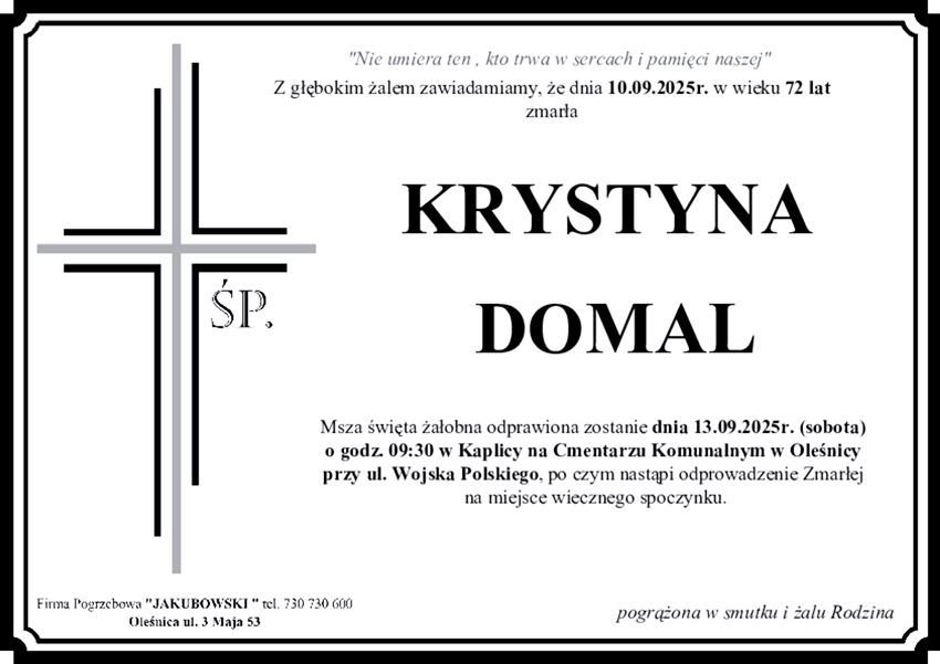 10 września w wieku 72 lat zmarła Krystyna Domal. Msza św. pogrzebowa zostanie odprawiona 13 września o godzinie 9.30 w kaplicy na cmentarzu przy ul. Wojska Polskiego, po czym nastąpi odprowadzenie zmarłej na miejsce wiecznego spoczynku