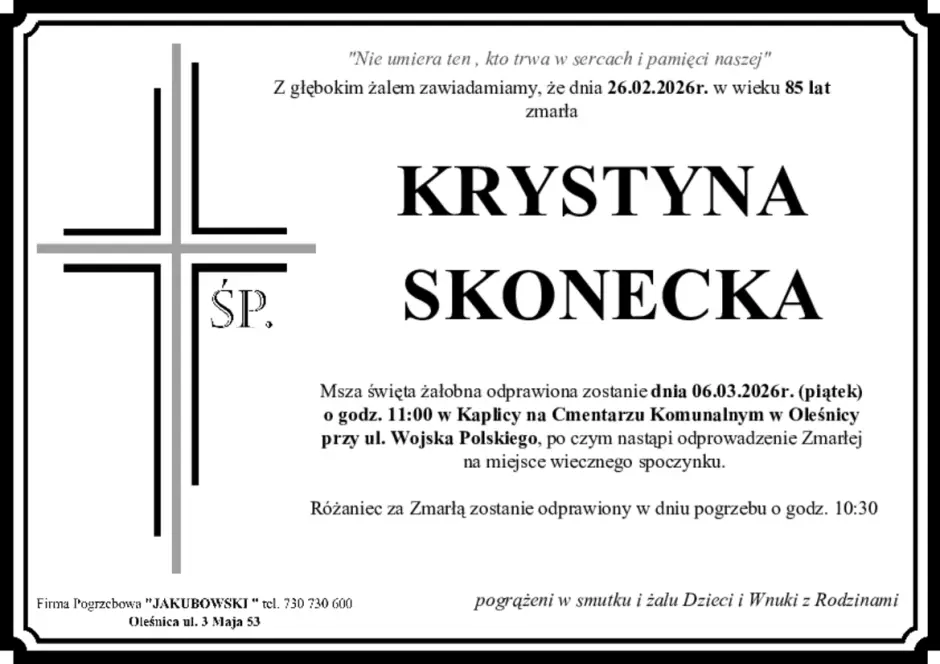 26 lutego w wieku 85 lat zmarła Krystyna Skonecka.