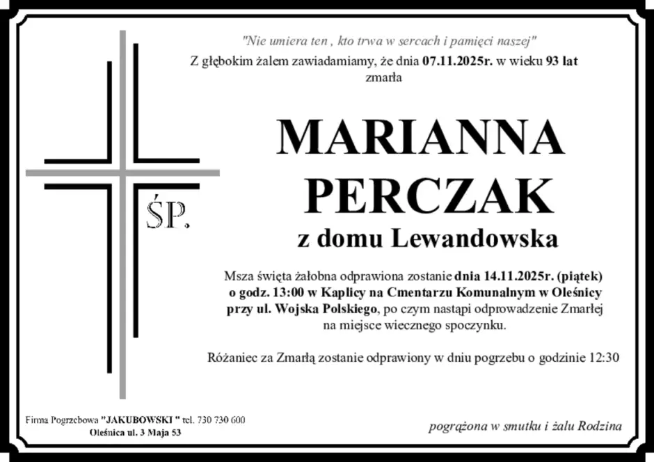 7 listopada w wieku 93 lat zmarła Marianna Perczak z d. Lewandowska. Msza św. żałobna zostanie odprawiona 14 listopada o godz. 13 w kaplicy na cmentarzu przy ul. Wojska Polskiego, po czym nastąpi odprowadzenie zmarłej na miejsce wiecznego spoczynku.