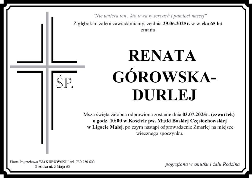29 czerwca w wieku 65 lat zmarła Renata Górowska-Durlej.