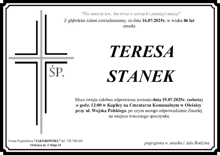 16 lipca w wieku 86 lat zmarła Teresa Stanek.