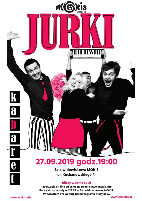 Miejski Ośrodek Kultury i Sztuki w Oleśnicy zaprasza na występ kabaretu JURKI, który odbędzie się 27 września o godz. 19 w sali widowiskowej.