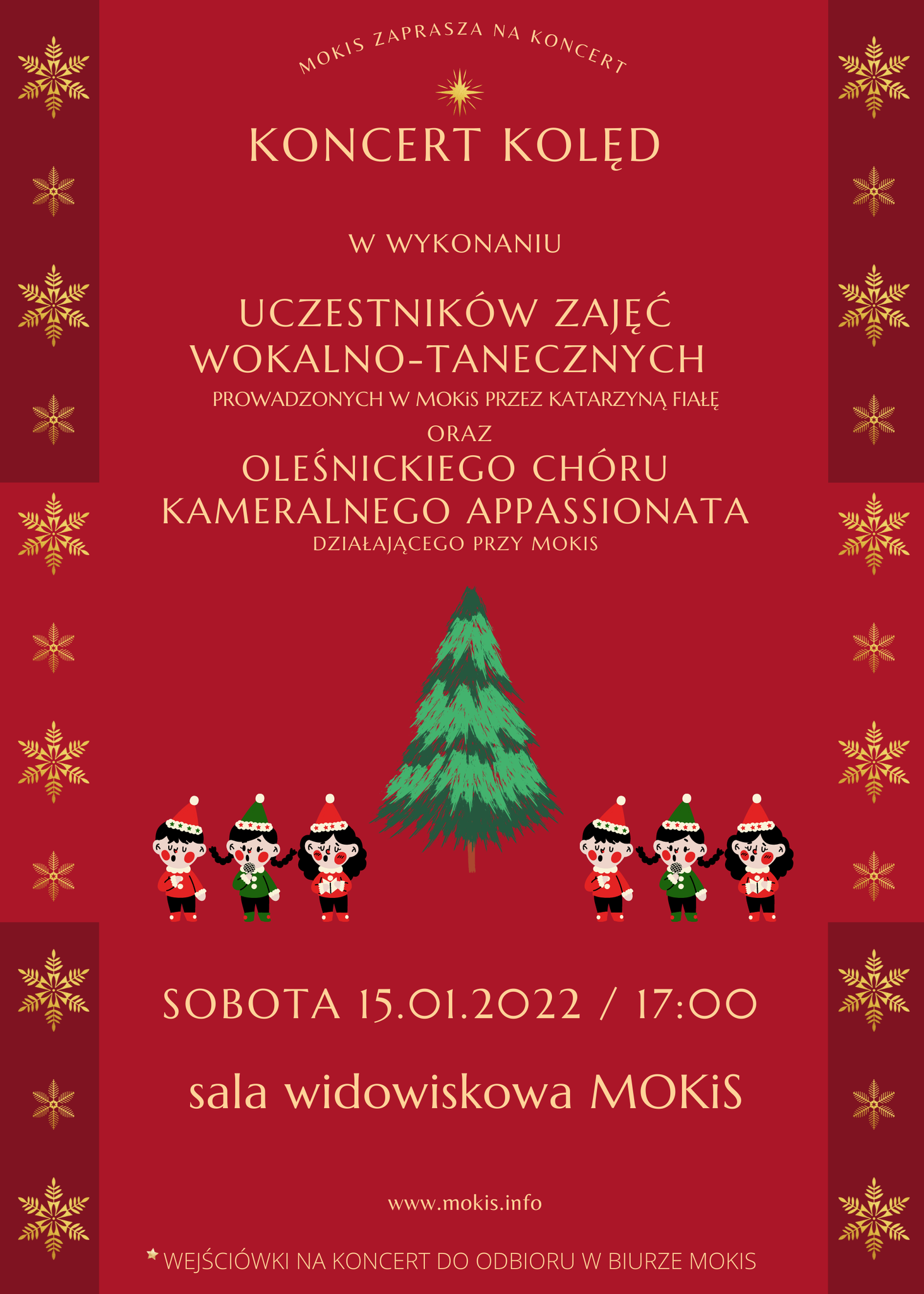 15 stycznia o godzinie 17 w Miejskim Ośrodku Kultury i Sztuki w Oleśnicy odbędzie się koncert kolęd w wykonaniu uczestników zajęć wokalnych prowadzonych w MOKiS przez Katarzynę Fiałę oraz Oleśnickiego Chóru Kameralnego APPASSIONATA. Bezpłatne wejściówki można odebrać w biurze MOKiS od poniedziałku 10.01.2022 r.