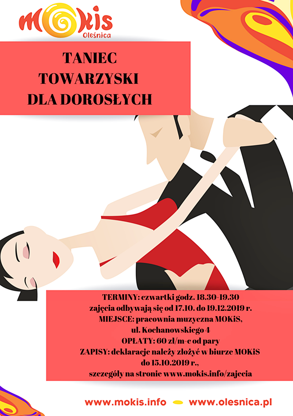 Kurs rozpocznie się 17.10 i będzie trwał do 19.12. Zajęcia będą odbywały się w czwartki w godzinach 18.30-19.30 w pracowni muzycznej MOKiS, ul. Kochanowskiego 4. Koszt zajęć to: 60 złotych miesięcznie od pary, płatne do 22.10 za październik i do 10. każdego miesiąca za listopad i grudzień. Wypełnioną deklarację udziału należy złożyć do 15 października w biurze MOKiS, ul. Kochanowskiego 4. Deklarację można pobrać ze strony.