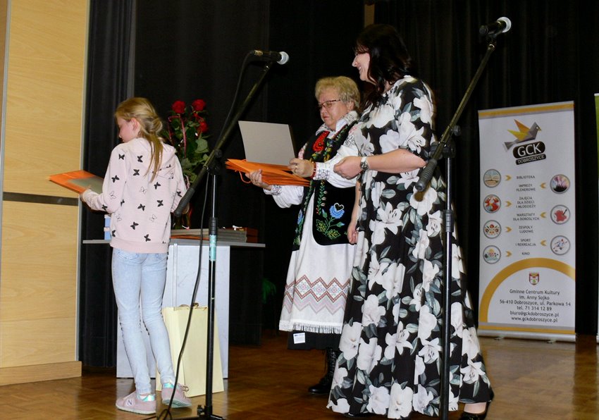Laureaci konkursu „Architektoniczne i przyrodnicze skarby Gminy Dobroszyce”: Kuba Lechowicz, Agata Łoboda, Milena Czerniawska, Antonina Pająk, Patrycja Guder, Fabian Zieliński, Lena Mikuła, Grupa I dziewcząt z SOSzW „Caritas” w Dobroszycach, Anna Mikuła, Janusz Markiewicz.