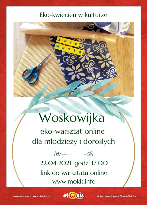 – 22 kwietnia (czwartek) o godz. 17 zapraszamy na eko-warsztat z tworzenia woskowijki, który przeznaczony jest dla młodzieży i dorosłych. W trakcie warsztatu uczestnicy dowiedzą się, co to są woskowijki i jak można je samodzielnie wykonać – informują pracownicy ośrodka kultury.