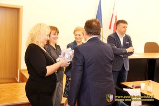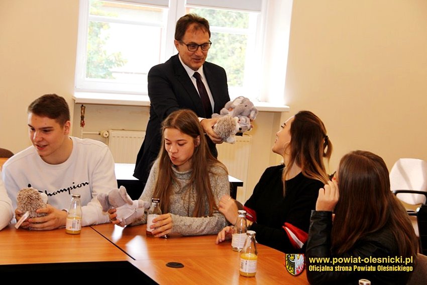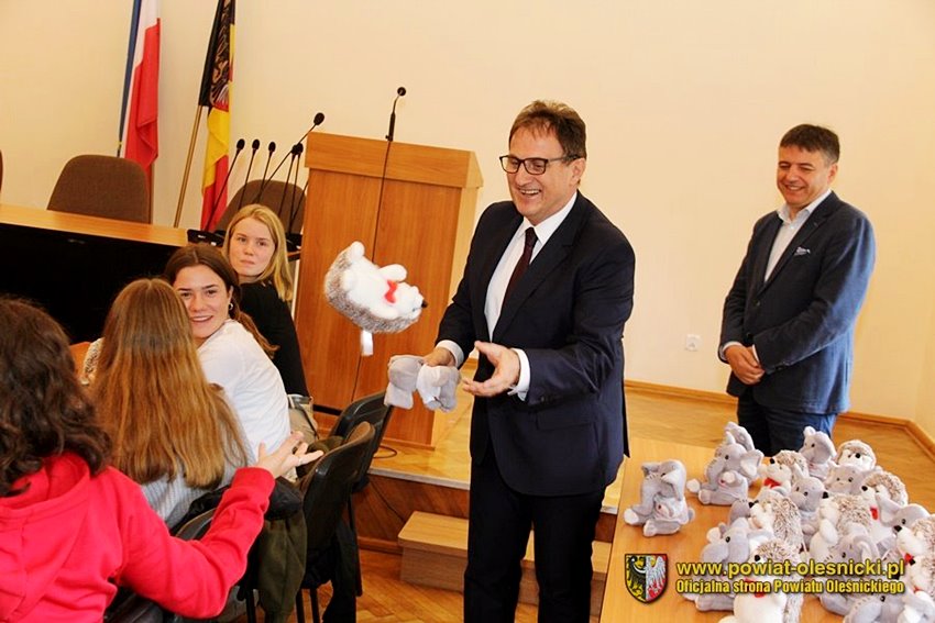 Witając swych gości, Jan Dżugaj podzielił się informacjami na temat powiatu, zapytał ich o najbliższe plany uczestniczył też w krótkiej pogadance na temat cyberprzemocy, która jest głównym tematem tegorocznego projektu. – Bądźcie ostrożni, uważajcie na siebie – zaapelował do uczniów, którzy potwierdzili, że Internet ma swoje dobre, ale i złe strony, dlatego może być wykorzystywany w różny sposób. Na koniec krótkiej wizyty w starostwie uczestnicy wymiany zostali obdarowani powiatowymi gadżetami, z których najbardziej przypadły im do gustu te w postaci jeżyków.