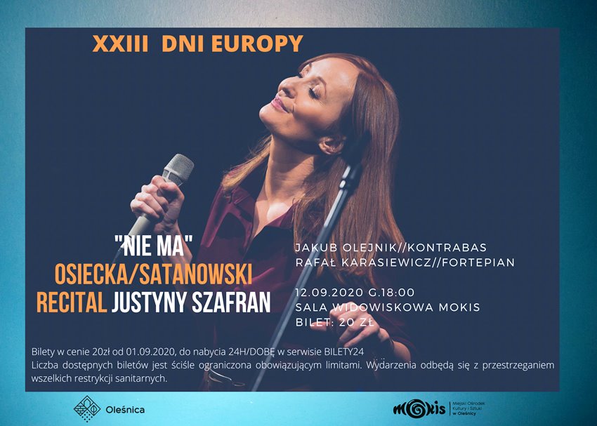 Miejski Ośrodek Kultury i Sztuki w Oleśnicy zaprasza 12 września o godz. 18 na recital Justyny Szafran „Nie ma”Osiecka/Satanowski. Koncert odbywa się w ramach tegorocznych XXIII Dni Europy.