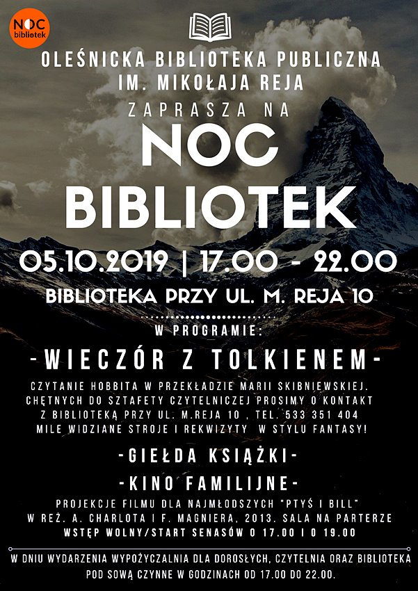 W programie m.in: Wieczór z Tolkienem czyli czytanie „Hobbita” w przekładzie Marii Skibniewskiej. Chętnych do sztafety czytelniczej organizatorzy proszą o kontakt z biblioteką przy ul. Reja 10 , tel. 533 351 404 . Mile widziane stroje i rekwizyty w stylu fantasy! Odbędzie się też nocna giełda książek oraz Kino Familijne i projekcje filmu fabularnego dla najmłodszych „Ptyś i Bill” w reż. A. Charlota i F. Magniera. Start seansów o 17 i 19. Wstęp wolny!