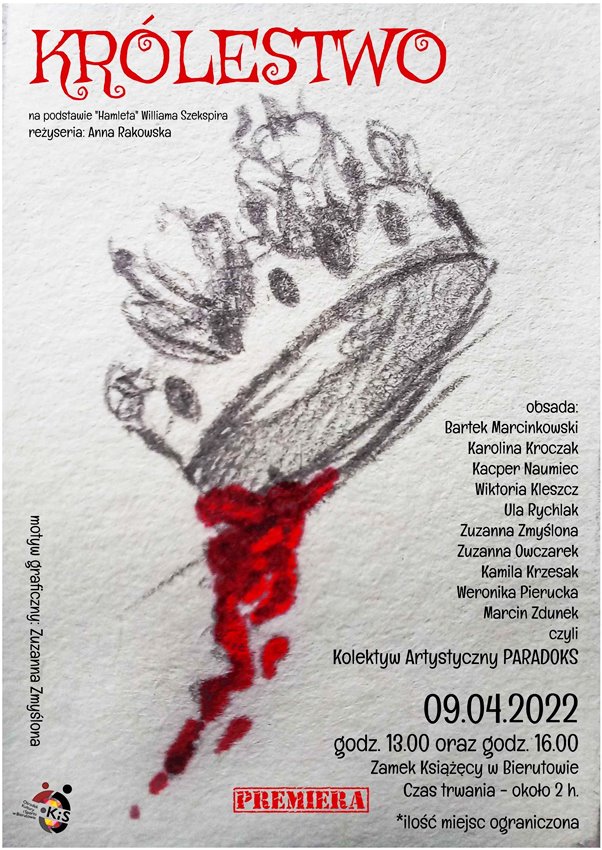 9 kwietnia OKiS zaprasza na wyjątkowe wydarzenie. W Zamku Książęcym w Bierutowie odbędzie się premiera spektaklu „Królestwo” na podstawie „Hamleta” Williama Szekspira w reżyserii Anny Rakowskiej, w wykonaniu grupy teatralnej działającej przy Ośrodku Kultury i Sportu w Bierutowie Kolektyw Artystyczny Paradoks.