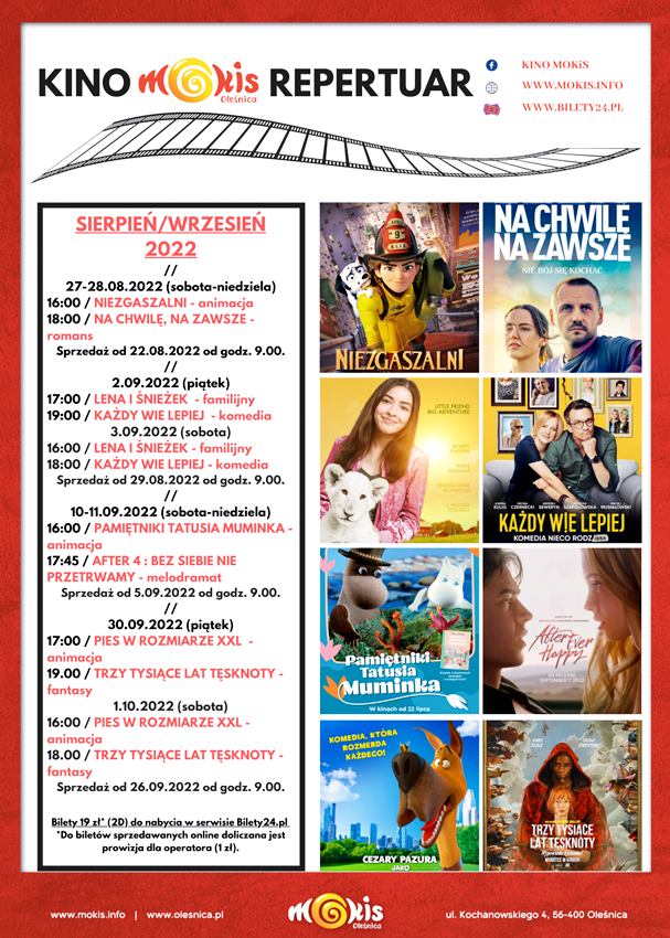 Miejski Ośrodek Kultury i Sztuki w Oleśnicy zaprasza do zapoznania się z sierpniowo-wrześniowym repertuarem KINA MOKiS.