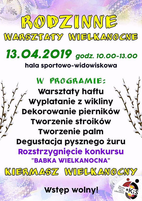 Ośrodek Kultury i Sportu zaprasza na Rodzinne Warsztaty Wielkanocne. Odbędą się one 13 kwietnia w godz. 10 – 13 w hali sportowo-widowiskowej w Bierutowie.