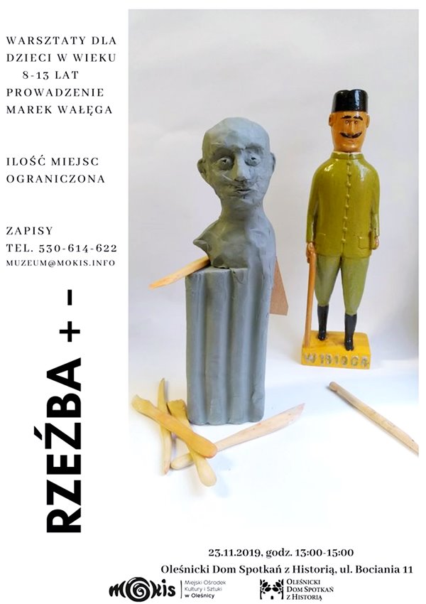 W sobotę 23 listopada Miejski Ośrodek Kultury i Sztuki zaprasza na warsztaty „Rzeźba + -„. Zajęcia dla dzieci w wieku 8-12 lat odbędą się w Oleśnickim Domu Spotkań z Historią w godzinach 13-15.