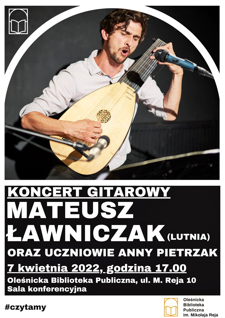 7 kwietnia 2022 (czwartek) o godzinie 17.00 w sali konferencyjnej odbędzie się koncert gitarowy uczniów Państwowej Szkoły Muzycznej w Oleśnicy z klasy Anny Pietrzak. Gwiazdą wieczoru będzie występ Mateusza Ławniczaka – absolwenta Akademii Muzycznej we Wrocławiu w klasie gitary prof. Piotra Zaleskiego oraz Waldemara Gromolaka, który zaprezentuje unikalny repertuar pieśni z czasów Szekspira.