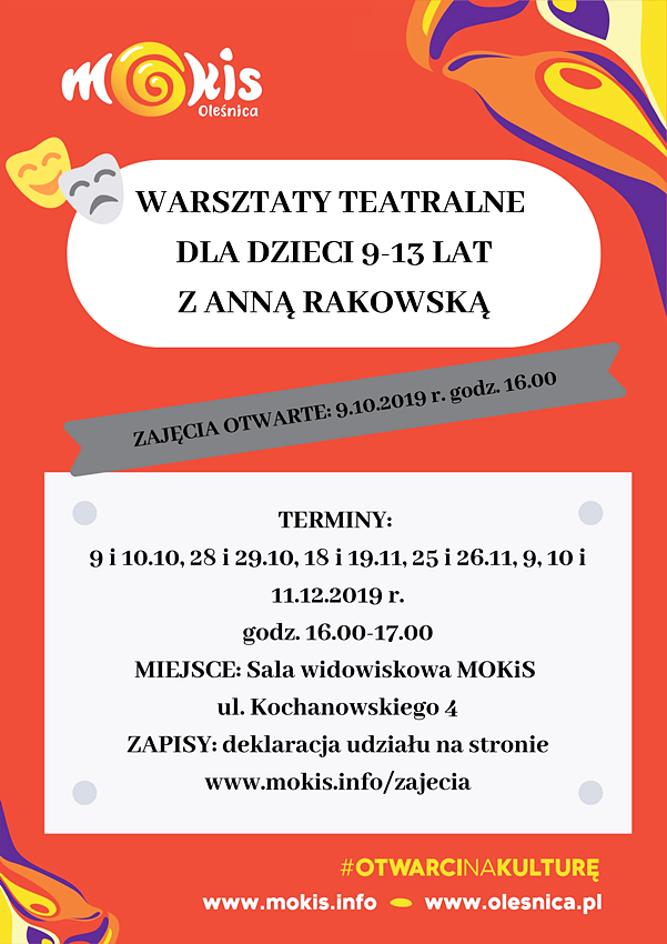 Miejski Ośrodek Kultury i Sztuki w Oleśnicy zaprasza od października na warsztaty teatralne dla dzieci i młodzieży, które prowadzi Anna Rakowska.