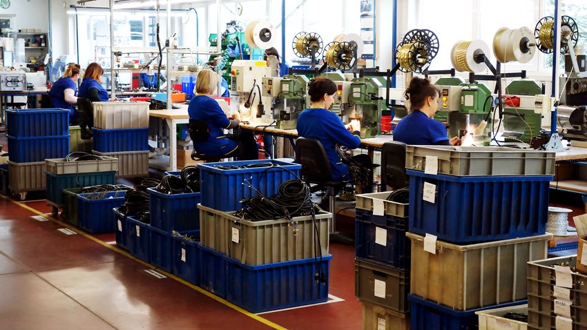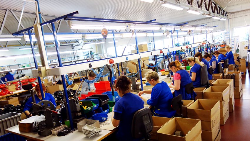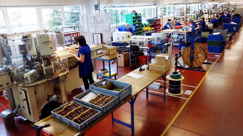 Obszar produkcji w zakładzie podzielony jest na kilka różnych działów. Jednym z nich jest centrum obróbki tworzyw sztucznych, gdzie każdego roku na maszynach wtryskujących wytwarzanych jest ponad milion różnych komponentów plastikowych. które są później używane na liniach montażowych przy składaniu wyłączników. Kolejnym działem produkcyjnym jest obszar produkcji przewodów i wiązek kablowych, gdzie pracownicy zajmują się obróbką przewodów elektrycznych poprzez ich cięcie, odizolowanie oraz montaż końcówek na prasach pneumatycznych. – Najciekawszą częścią kablowni jest nowoczesne centrum obróbki przewodów z jedną z najlepszych i najwydajniejszych na świecie maszyn do automatycznego cięcia, odizolowywania oraz zakładania różnych końcówek na kable elektryczne – mówi dyrektor. – Głównym działem produkcyjnym jest obszar z liniami montażowymi, w którym pracownicy składają z różnych komponentów gotowe wyłączniki poddawane w końcowym etapie kontroli elektrycznej, jakościowej oraz bezpieczeństwa. Nasi pracownicy ze względu na precyzyjny montaż drobnych elementów muszą wykazywać się dokładnością oraz bardzo dobrą sprawnością manualną – podkreśla.