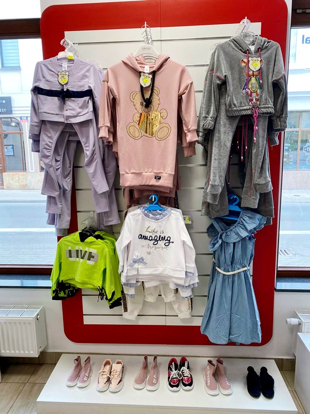 W ładnie urządzonym, przestronnym wnętrzu znajdziemy ubrania dla dzieci od pierwszych lat życia do 13 roku życia. Na wieszakach królują hiszpańskie marki słynące z bardzo dobrej jakościowo i starannie wykonanej odzieży dla dzieci, czyli Mayoral i Losan. Modne ubrania zachwycą i rodziców, i małych klientów sklepu.