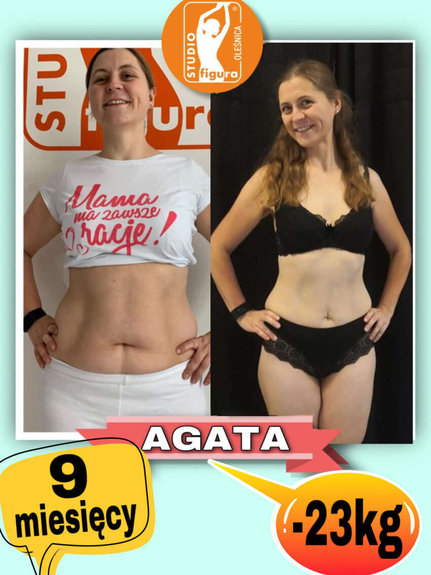 Cel był jasno określony – zrzucenie 18 kilogramów w pół roku, poszło mi zdecydowanie szybciej i po czterech miesiącach moje BMI było już w normie. Naprawdę nigdy nie pomyślałabym, że odchudzanie może być tak szybkie i przyjemne! Jestem ogromnie wdzięczna całemu personelowi zatrudnionemu w studio. Profesjonalne doradztwo w zakresie stosowania suplementów i kosmetyków oraz wsparcie jakie dostałam od mojej opiekunki były dla mnie bezcenne. Moja motywacja nie miała szansy przygasnąć nawet na chwilę, bo efekty były widoczne z tygodnia na tydzień. Odchudzanie w Studio Figura Oleśnica było dla mnie przyjemnością. Nie umiem i nie chcę rozstać się z tym miejscem, dlatego do dziś dwa-trzy razy w tygodniu chodzę tam poćwiczyć. Drogie Panie – jeżeli zastanawiacie się, czy warto zrobić ten pierwszy krok, pójść i sprawdzić, co oferuje to wyjątkowe miejsce na mapie Oleśnicy, to zdecydowanie Was namawiam! Zróbcie to dla siebie i może za kilka miesięcy Wy również powiecie: jestem lżejsza, zdrowsza, szczęśliwsza!