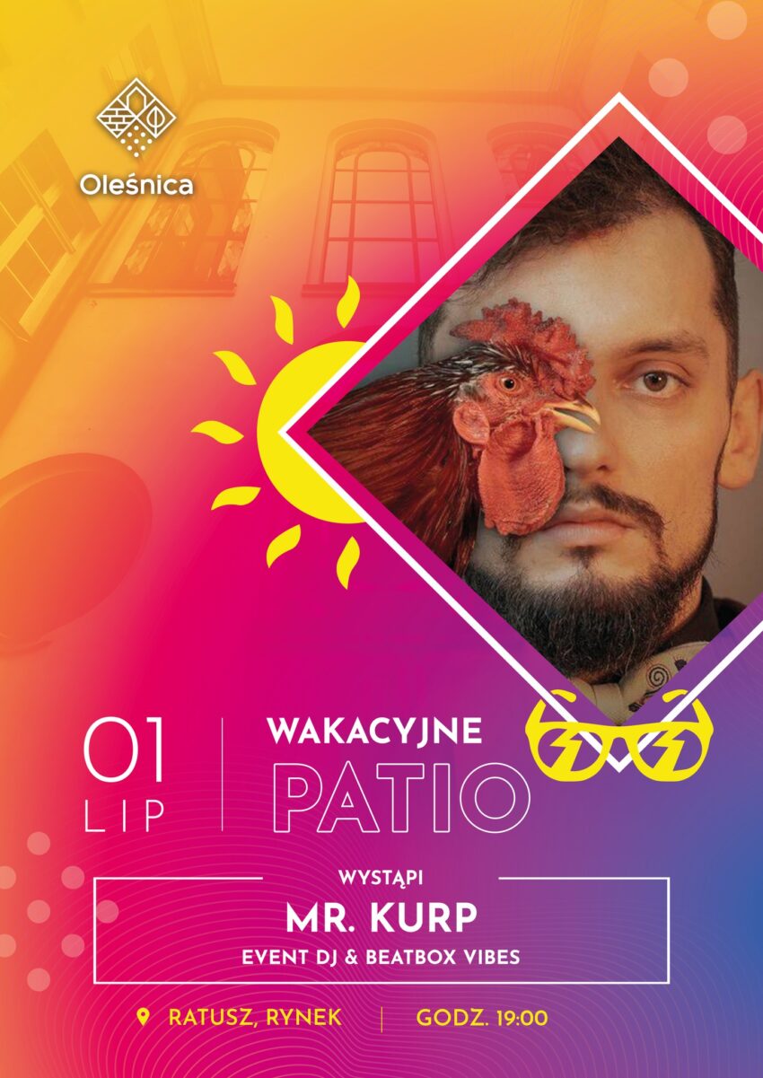 – W tym roku w każdy sobotni wieczór bramy patio ratuszowego będą szeroko otwarte dla mieszkańców i przyjezdnych, a czas tam i niezwykłą atmosferę będą tworzyć nasi oleśniccy utalentowani artyści – zachęca oleśnicki ratusz. – Rozpoczynamy w beatboxowym vibem i super DJ! Przyjdźcie posłuchać mistrza i potańczyć! Będzie super! Start o godz. 19.  Wstęp wolny.